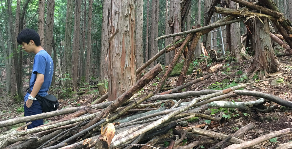 在2015年時,我在日本長野縣的木崎湖旁森林裡完成了「水氣場」作品,以在森林間的自然雕塑回應當地龍的傳說與水的精神召喚。4年過去,在2019年的夏天我再度來到了這裡,先前森林中的作品已經回歸到這片大地,成為森林的一部分。