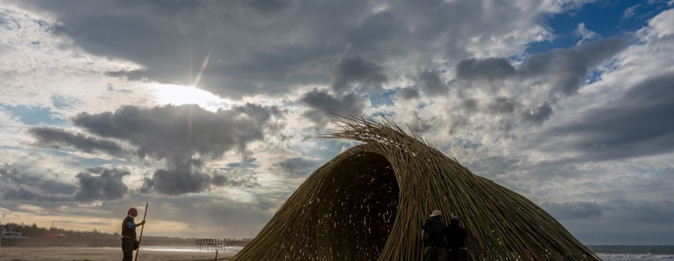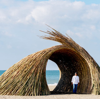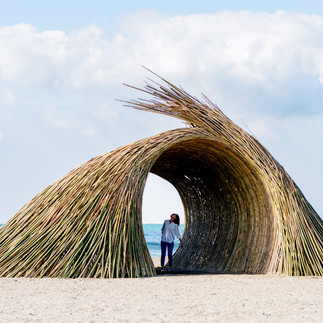 This work takes wind as its central theme. Here, the wind is not merely an external force of nature; it is a cohabiting presence that shares the same space with us. "Windscript" is composed of overlapping bamboo elements, forming a curved, dynamic structure whose posture resembles sea winds lifting the dunes, or the meteorological ridgelines traced by air currents carving across the landscape. It is like a fissure through which the wind penetrates the earth, and at the same time, a ritual of resonance between wind and body.