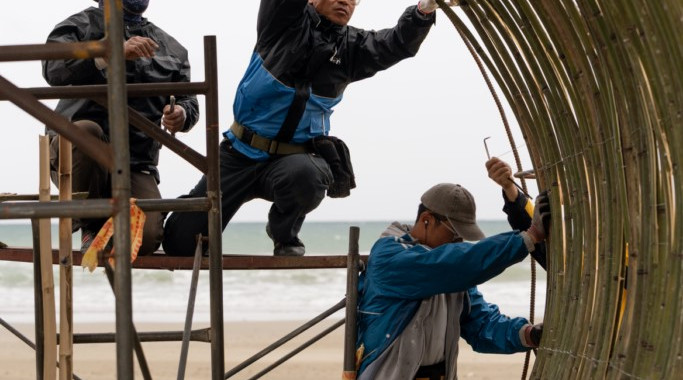 At Haikou in Pingtung, the downslope wind is not just a passing weather event, but a presence that runs through the flow of time. When one walks to the edge of the coastline, the body ceases to be the protagonist and becomes a receiver of the wind — the work "Windscript" is born in this kind of liminal meteorological field. Using bamboo as a writing tool, it inscribes pathways for air to pass through, building nests for the wind.